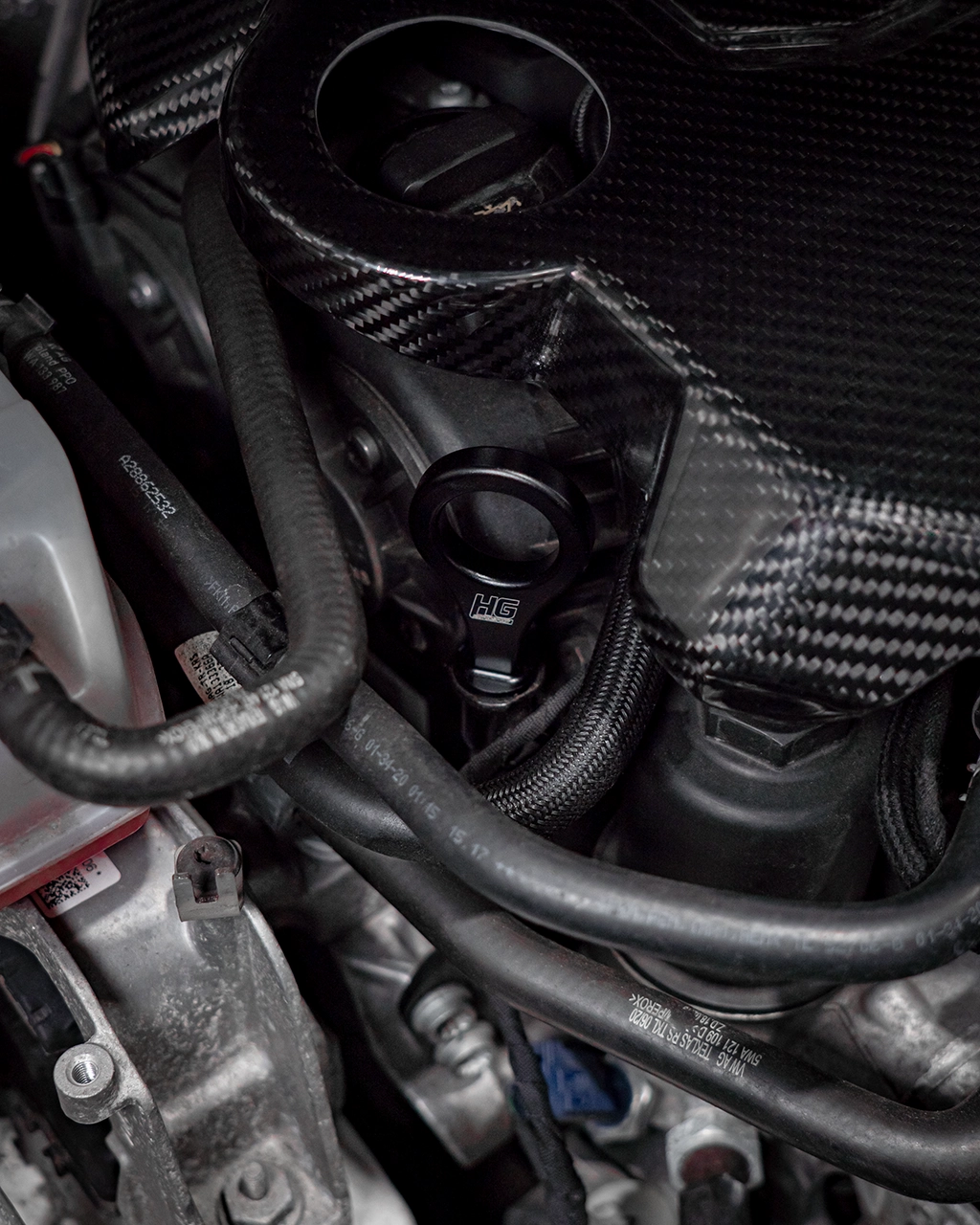 Black anodized and with a laser-etched HG-Motorsport logo, your engine compartment will be visually enhanced immediately.